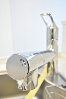水栓は浄水機能付きシャワー水栓。切替えるだけで気軽に美味しいお水を使う事が出来ます。ヘッドが伸びるので、シンクや大きな鍋のお掃除も楽々ですよ。