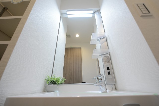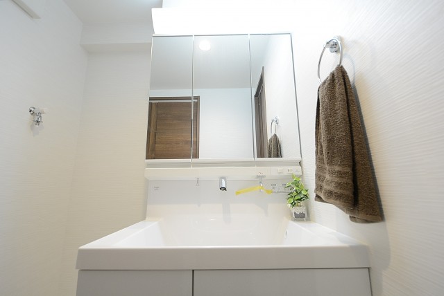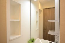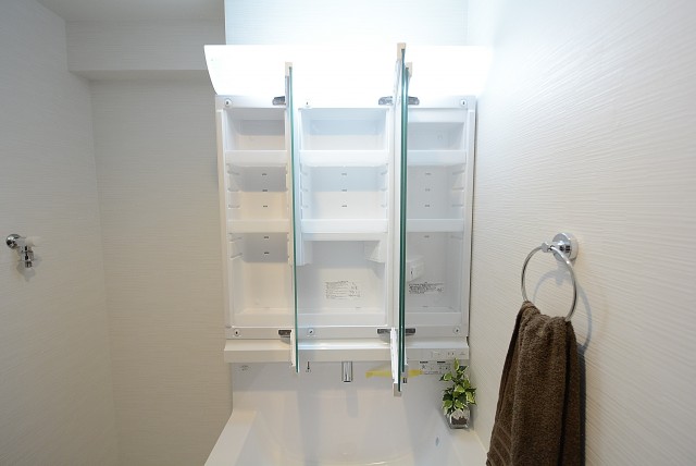 洗面化粧台は三面鏡になっています。