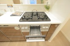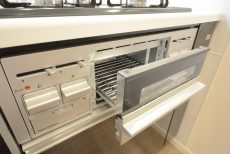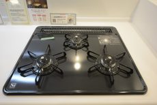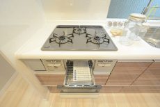 3口のグリル付きガスコンロが付いています。