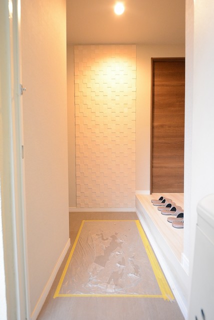 壁の一部にエコカラットが使われた玄関、シューズボックスはトールタイプで中の棚板は自由に調節することが出来るので、ブーツの様な背の高い履物でも問題なく収納できます。