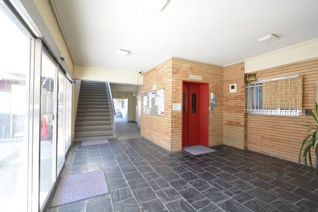 エントランスを入ってホール。階段やエレベーターがあります。レンガに赤いエレベーターがカワイイですね。