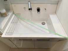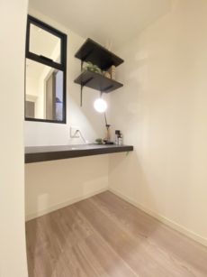 洗面台は三面鏡付き。上部の照明のおかげで、鏡を見る時に影になったりする事もありません。