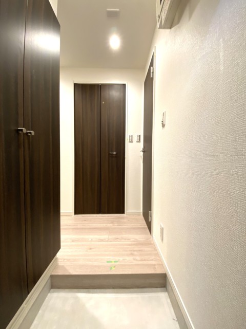 中に入ると廊下は左に伸びていて、お部屋はその先になります。宅配便やフードデリバリーを受取る時にお部屋の中を見られる心配もありませんね。明るめのフローリングにダークブラウンの扉がアクセントになっています。