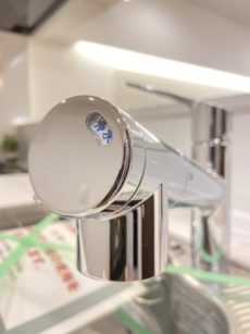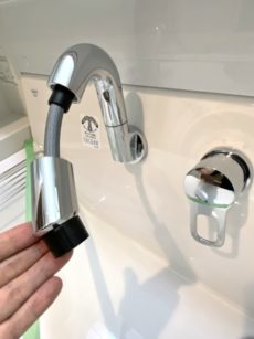 水栓は浄水機能付きシャワー水栓。切り替えるだけで気軽に美味しいお水を使えます。ヘッドが伸びてシンクを流したりにも便利ですよ。