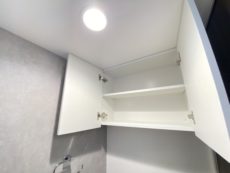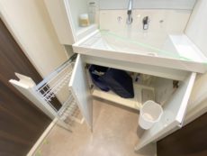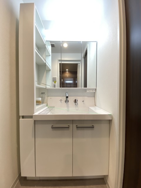 収納は三面鏡裏のキャビネットとサイドの棚、そして洗面台下。収納はいくらあっても邪魔になりませんからね、たくさんあるのは助かります。