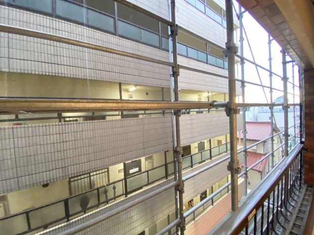 ちょうど大規模改修工事が始まるところで、足場が組まれつつありました。バルコニーも綺麗になるといいですね。前には比較的近い距離にマンションがあります。外廊下側なので比較的人の目は少ないと思いますが、多少気になるかもしれません。