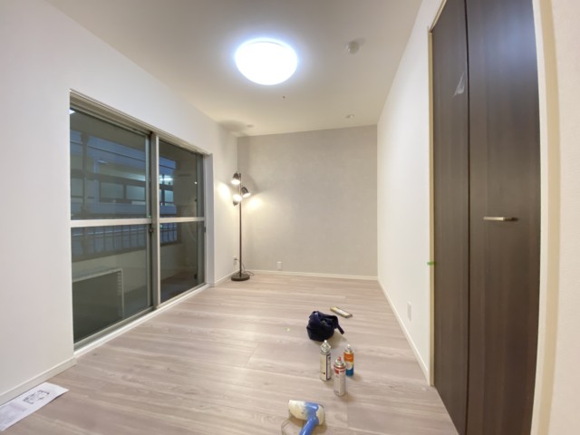こちらは約5.6帖の洋室。西向きのバルコニーに面したお部屋です。引き戸を使用しているので、お部屋のスペースを無駄なく使う事が出来ますよ。開けておけばワンルームのような使い方も出来るので、ご家族構成やライフスタイルなどで使い分けられます。(実は手直し工事中にお邪魔したので、床にいろいろ置いてあるのはご容赦を)