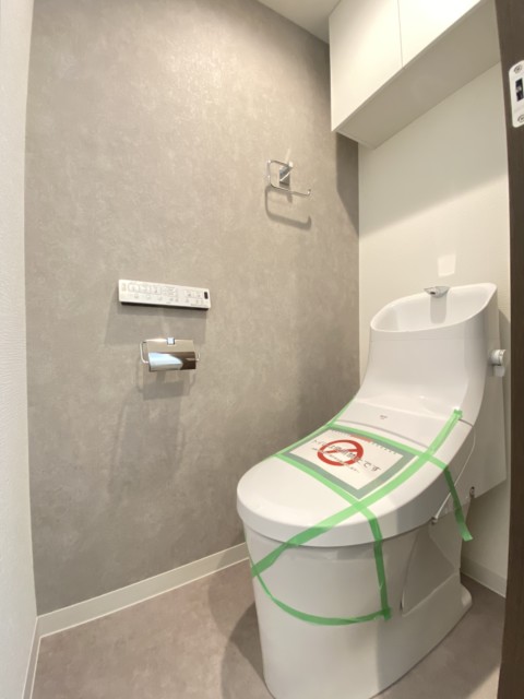 トイレは洗浄便座付き。TOTO製のウォシュレットです。トイレットペーパーなどのストックに便利な吊戸棚も付いていますよ。