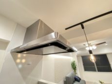 お部屋に匂いが付きますので、調理中は換気扇をお忘れなく。少し早めに回し始めると効果的らしいですよ。調理台後方には冷蔵庫や家電ラックのスペースや収納棚もありました。