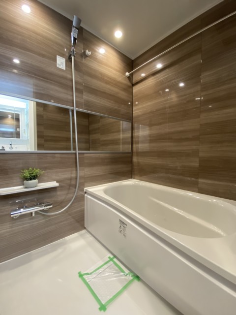 浴室は木目の鏡面仕上げパネルの高級感のある雰囲気。