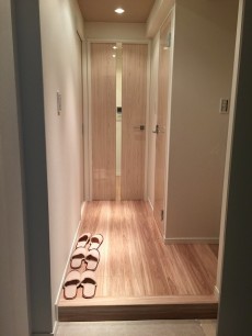扉を開けると フルリノベーションを終え綺麗に生まれ変わった玄関がお出迎え☆優しい風合いのフローリングの床を明るい照明が照らしています(*´▽`)