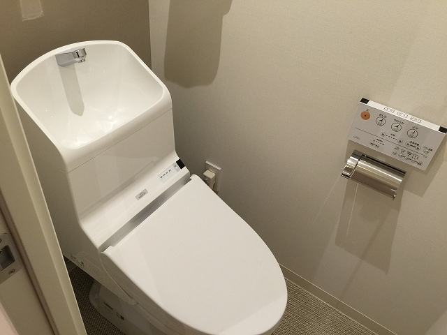 一度廊下に戻って、お隣はウォシュレット付きのトイレです。上部には扉付きの棚があるので、ストック品の収納や消臭剤を置くスペースとして利用してみて下さい♥♡
