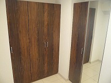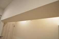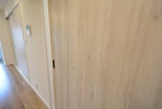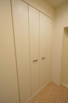 そして同じく壁一面が収納になっています。気になる方はカーテン等で目隠しをつけてもいいかもしれません。ちなみに中住戸なので外に面していませんが、明かりとりの窓がついています。(窓の外は廊下です。)これがあるだけで閉塞感が緩和される気がします。