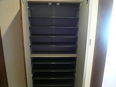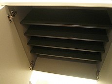 シューズBOXはご覧の通り収納力がバッチグー。扉の内側には縦長の鏡がさりげなくついているのでお出かけ前の身だしなみチェックもササッと済ませられます。