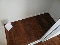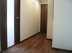 フローリングの濃いブラウンが暖かさを感じる廊下、突き当たりはサニタリールームです。