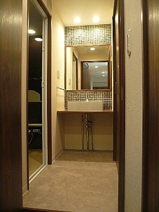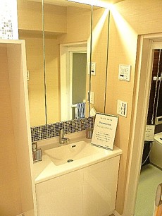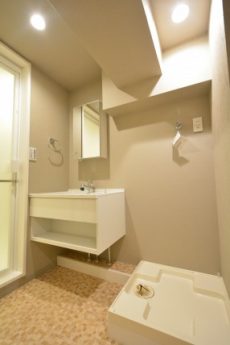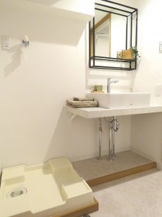 ■洗面室:洗面台(TOTO製三面鏡)交換、防水パン交換、フロアタイル貼り