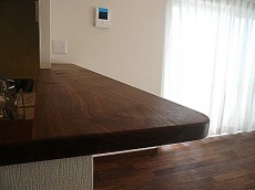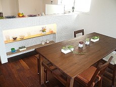 造作カウンターLD側は棚になっています。みせる収納でおしゃれ度もあがりますね。