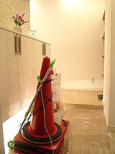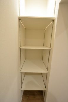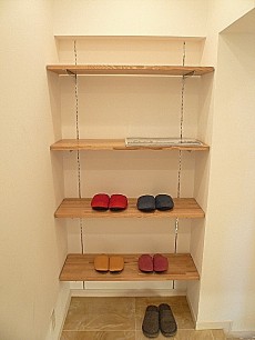玄関入って右手には造作棚があります。可動式なので高さのあるものも置けますね。