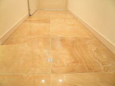 左手にある廊下です。高級感ある大理石調の床はピッカピカ~正面にみえる扉のガラスはチェッカーガラス、普段みないおしゃれなガラスですね。