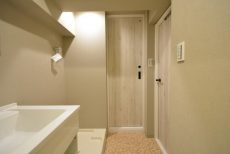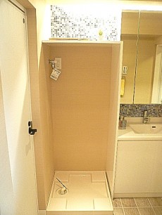 サニタリールームです。左側に浴室 正面に洗面化粧台 右側に洗濯機置き場プラス収納。