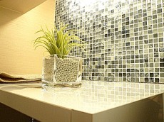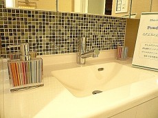 小さなタイル使いがオシャレですね。右側には小物が置ける棚があり、お気に入りのフレグランスなど置きたくなります~