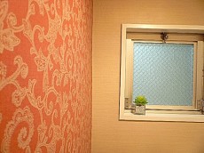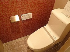 TOTO製ウォシュレット付トイレです。唐草模様のクロスがアクセントで華やかな雰囲気です。