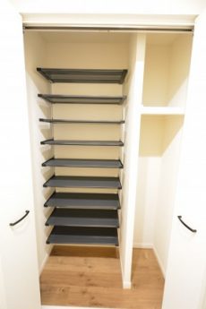 玄関収納です。これだけの収納量があれば安心ですね。左下のスペースには傘が置けそうです。玄関は一番はじめに目にする場所、いつもスッキリ清潔感ある空間にしたいですね。