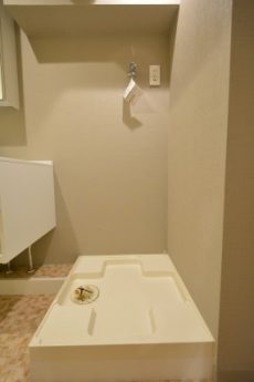 左側には洗濯洗剤など置けそうな棚と窓があり、右側には高さのある細みの棚があります。