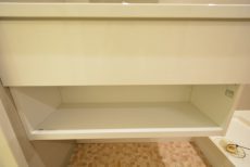 AICA製洗面化粧台です。上下にはしっかりと収納もでき、ミラー裏のキャビネットには細々したものが整理整頓できそうです。美しさだけでなく機能性を兼ね備えたアクリル系人口大理石ボウル付きカウンターです。両サイドにはスペースがあるのでコップなどが置けそうです。
