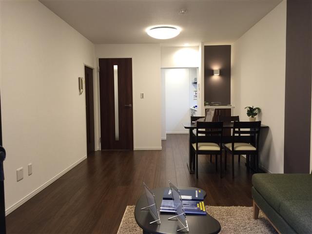 リビングダイニングキッチンは、約13.5帖の広々としたお部屋☆開口部は南向きです。東側の壁にはグレーのストライプ☆洋室へはこちらのリビングダイニングキッチンから出入りすることになりますので自然と家族のコミュニケーションが増える造りです。