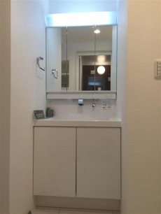 お隣は、洗面室&バスルームです。一段高くなっています。右手に洗面台、正面に洗濯機置場、左手にバスルームの並びになっています。