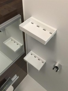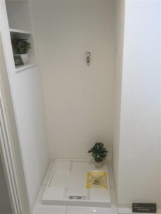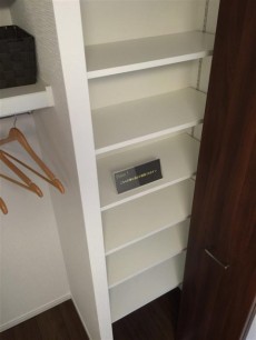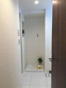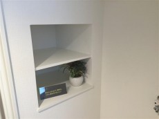 洗濯機置場の左手には、スペースを有効利用した棚が設置されています。洗剤等の収納も安心です。