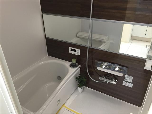 バスルームは、落ち着いた配色でリラックスできる空間です。バスタブも大きめサイズです。追炊き機能付きなので、いつでも温かい湯船に浸かれるのは嬉しいですね。