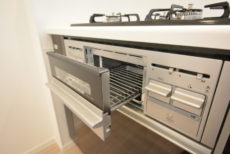 コンロは3口、片面焼きグリル付き。調理器具も充実です。