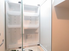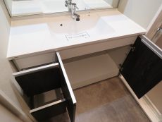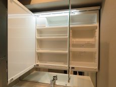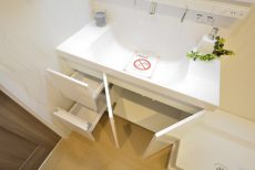 洗面化粧台も実は収納豊富。鏡の裏、引き出し、シンク下と小物も整理整頓してしまっておけます。散らかりやすい場所ですが、これだけ収納スペースがあれば毎日片付いた状態をキープできそうです。