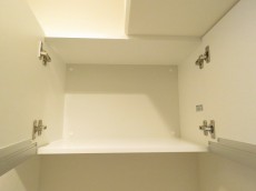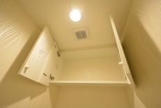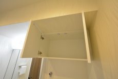 洗濯機スペースの上部には収納も付いています。洗剤や洗濯ネットなど、洗濯関係の物をまとめて置いておけますね。