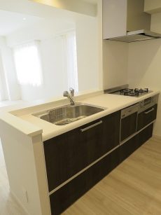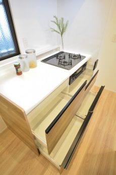 キッチンはお料理がはかどる3口ガスコンロ、浄水器内蔵水栓、キッチングッズの出し入れがしやすいスライド収納とスペック◎。匂いや熱もリビングの窓をサッとあければすばやく解消できるのではないでしょうか。