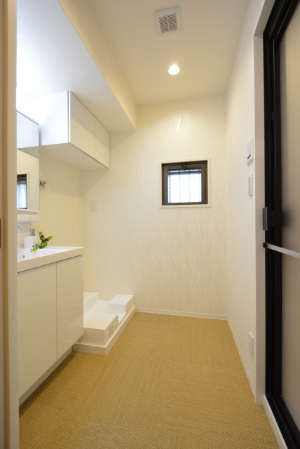 洗面化粧台、洗濯機置場、バスルーム、トイレと水廻りの設備がまとまった洗面室。お掃除もまとめて済ませやすいです。