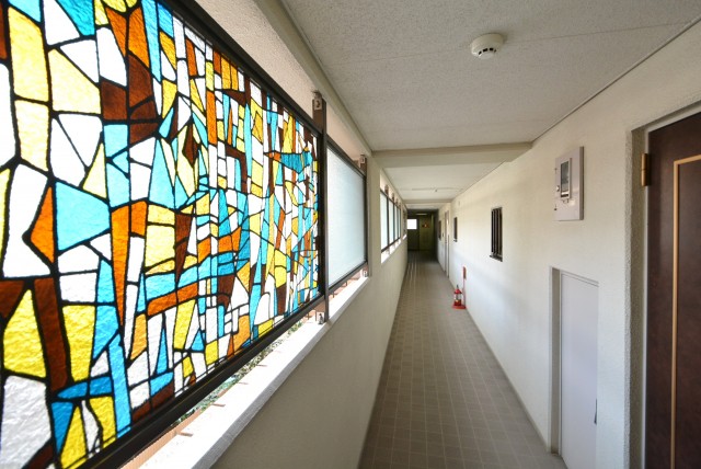 共用廊下は外廊下。ガラスのついたてがついているので外からの視線は気になりません。プライバシーが守られていいですね!このガラス、所々ステンドグラスっぽくなっていてキレイです。