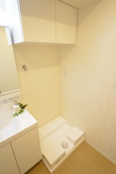 洗面室を入って左側は洗濯機置場。お隣には可動棚付きの背の高い収納がつくられています。タオルや洗剤、シャンプーのストックなど生活感のでがちなアイテムもこの中に仕舞っておけますよ!洗面室の備え付けの収納ってうれしいですよね。