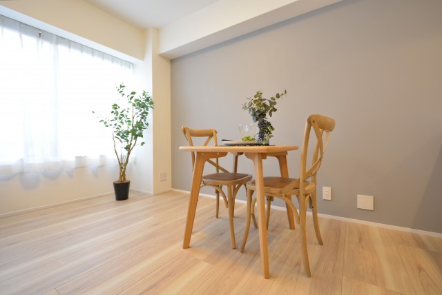 二人掛けのダイニングテーブルがありますが、四人掛けでも十分置けそうな広さがあります。