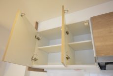 収納は上下にたっぷりありますよ。上部吊戸棚は多少出し入れがしづらいので、あまり使わない鍋やセイロなどを入れておくと良いですね。