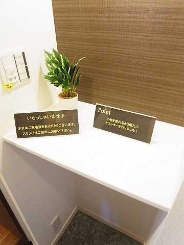玄関を開けると、すぐ右側にカウンターが作られています。下が空いているので、そこには傘や背の高いブーツなんかを置いて、カウンターはお気に入りの小物で、いっぱい飾ってみてください!