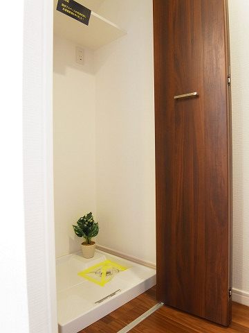 扉を開けると正面に洗濯機置場があります☆こちらは、階段下のスペースを利用しています。スペースを活用する工夫は嬉しいですね♪♪