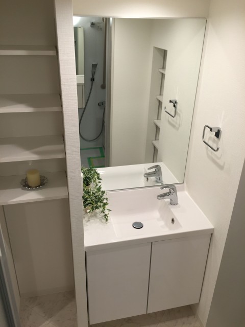 洗面台の反対側にも収納があります。奥行きもあって収納力◎