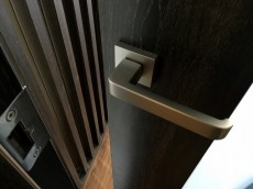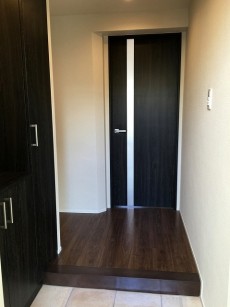 扉を開けると、リノベーション済みでピカピカです(*´˘`*)♡シックな色合いの木調の清潔感ある落ち着いた玄関です(●´∀`)玄関スペースには人感センサーがついているので、自動でパッと明かりもつきます。