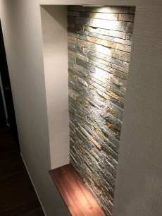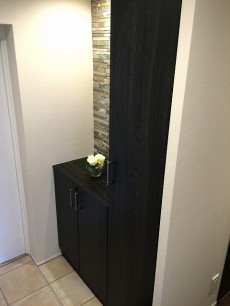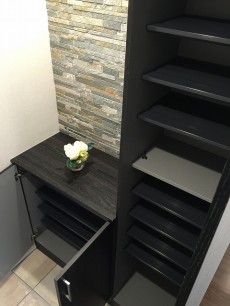 棚が可動式になっていますので、ブーツの収納もOK☆シューズBOXの上のカウンター部分はちょうどよいディスプレイスペース。インテリアや植物などを置けば華やいだ雰囲気に変わりそうです♪♪背面は石材で装飾され高級感があります♫