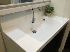 洗面台はお部屋の扉と同じトーンの木調パネルを使った大きな三面鏡付きの洗面台です。