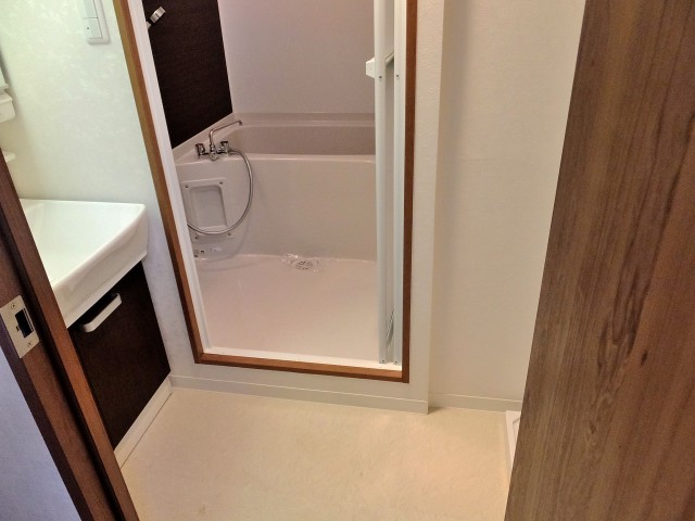 オフホワイトとブラウンのツートンカラーがオサレなバスルームは追い焚き機能付きだから、ただいまからお風呂までの時間を短縮できますね(#^.^#)