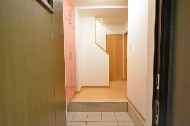 中に入ると、優しい木目調のフローリング、ドア、そして可愛らしいピンクのシューズボックスがありました。シューズボックスは天井までの高さがあるので、靴だけではなくブーツや長靴なんかもシッカリ収納できますね(^v^)